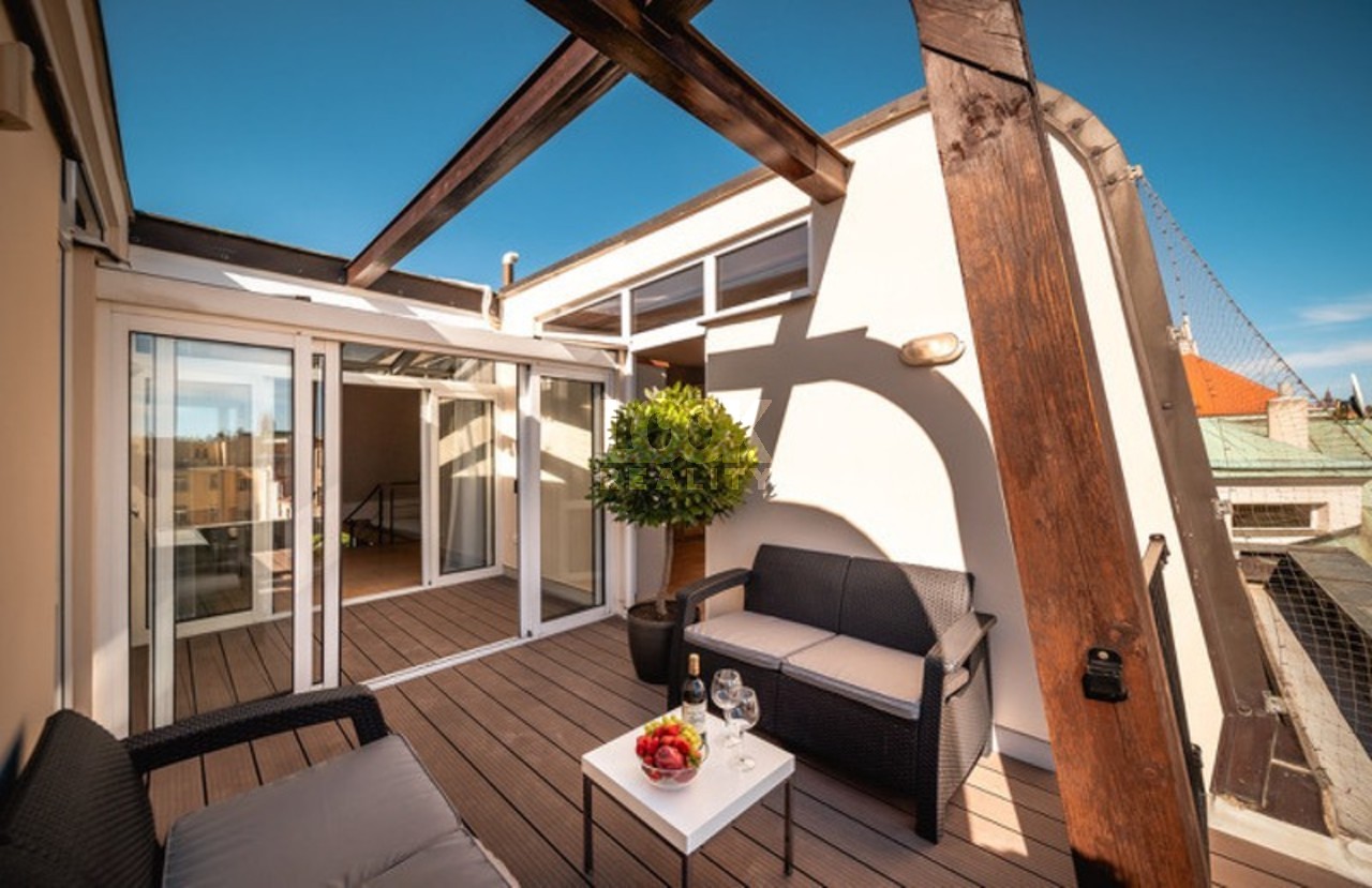 Beautiful apartment in an exclusive location in the heart of Prague. We offer to rent beautiful, duplex apartment 5 + 1 of 250 m2. The apartment is located on the 6th and 7th floor of an Art Nouveau building after reconstruction with a lift in Prague 2 - Nove Mesto. The apartment has a beautiful view of Prague Castle. The apartment consists of: spacious entrance hall, 4 bedrooms, spacious living room 74 m2 with beautiful view of Vltava, separate kitchen separated by glass sliding bar, 2 dressing rooms, storage, laundry, 3 bathrooms with bath, shower and bidet. The kitchen is equipped with appliances: hob, oven, dishwasher. The apartment is rented fully furnished, including bed linen and towels. Satellite dish with programs according to the client's wishes. The apartment is located in a popular location with all civic facilities. In the vicinity of the apartment you will find smaller shops and supermarkets that will provide everything you need for everyday shopping. Families will appreciate the close vicinity of kindergartens and primary schools, which are easily accessible. Lovers of good food and coffee will be delighted by the wide range of restaurants and cafes in the area. If you are looking for a wider range of shops, the Novy Smichov shopping centre is just a few minutes away. For moments of relaxation or sport, the surrounding parks are ideal, such as the Botanical Garden, where you can enjoy nature, or the nearby sports facilities. Transport accessibility is excellent in this location. The nearest stop is Palackeho Namesti (tram 2, 3, 4, 7, 10, 14, 16, 17, and 21 and metro B), which is a 4-minute walk away. The tram stop Vyton (tram 2, 3, 7, 17 and 21) is 500 metres away. Beautiful living in an exclusive location. Recommended.