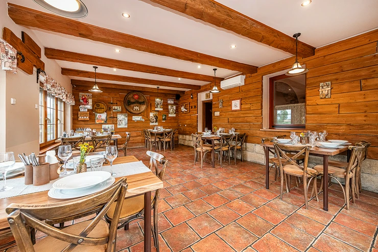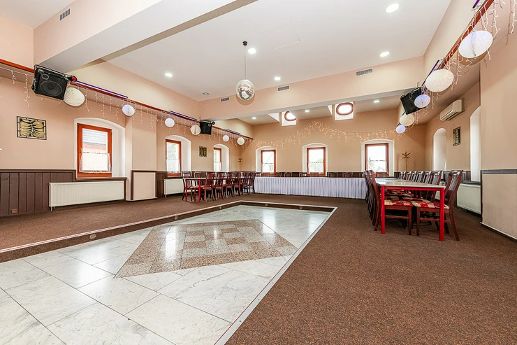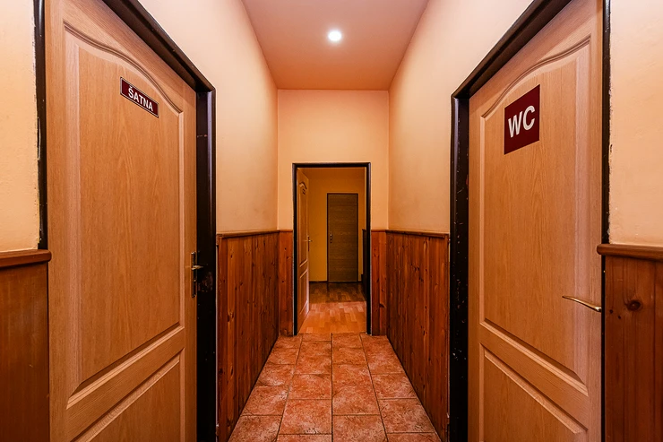 The property includes a spacious restaurant (90.51 m²) with a loyal clientele, a fully equipped kitchen (62.52 m²) ready for professional gastronomy, and a retail shop (53.19 m²) ideal for local products or complementary goods. The highlight is a multi-purpose hall (93.33 m²) – perfect for weddings, celebrations, corporate events, or cultural gatherings. Accommodation is provided by two apartments (each 35.95 m²), ensuring additional steady income.