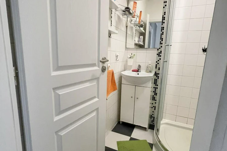 Apartment will be equipped: kitchenette with electric hob, microwave, fridge with freezer, basic kitchenware, bedding with bed linens, table and chairs, storage space, bed with mattress, comode, bathroom with shower, washbasin and toilet, electric heating.