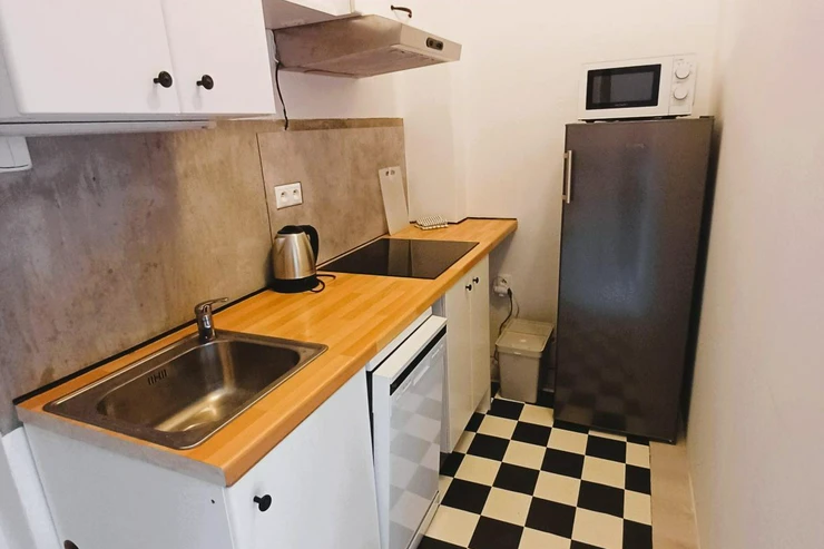 Fully equipped kitchen (fridge, electric hob, extractor hood, dishwasher, microwave, electric kettle, basic cookware and dishes)