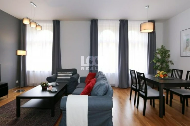 Luxury apartment in Prague 2 - Vinohrady, near park Grebovka. We offer to rent the beautiful apartment 3+kk of 95 m2. The apartment is located on the 3rd floor of the building with elevator in Moravska street. The apartment consists of a entrance hall, living room with kitchen, two separate bedrooms and bathroom. The apartment is fully furnished: sofa, coffee table, dining table with chairs, wardrobes and chests of drawers, beds, bedside tables, lamps. The kitchen is fully equipped with all appliances: hob, oven, hood, fridge, freezer, dishwasher, microwave, toaster, coffee maker, kettle. There is a bath, washing machine and toilet in the bathroom. In the flat there is a TV, DVD player, air condition and internet access available. Pets are allowed. Excellent transport accessibility. Near the apartment is a tram stop Jana Masaryka and metro station Namesti Miru. All civic amenities: restaurants, schools, shop, libraries, theaters, pharmacy, post office, sports facilities. There are also parks - Havlickovy Sady, Bezrucovy Sady, ideal places for walking, rest, or sports. Very pleasant living in a beautiful location. The price for a short-term can be changed. Available from September 25, 2025