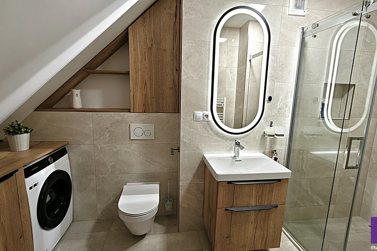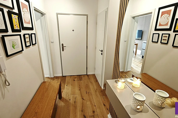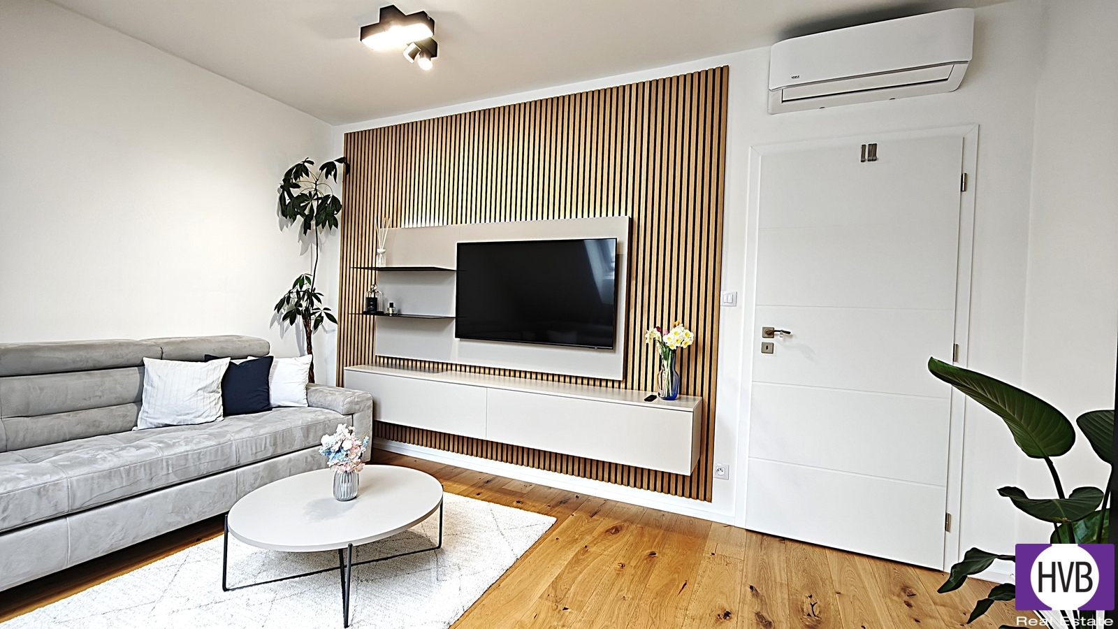 The apartment unit with air-conditioned rooms is equipped to a high standard, emphasizing both aesthetics and functionality, offered fully furnished. On its lower level, you will find a spacious living room, a dining area with a modern kitchen corner and a balcony, a bathroom with a bathtub, and a practical storage room; the upper level offers two more rooms and a bathroom with a shower. Both floors are elegantly connected by a designer staircase, with heating provided by a private boiler.