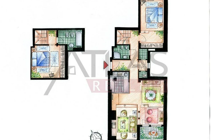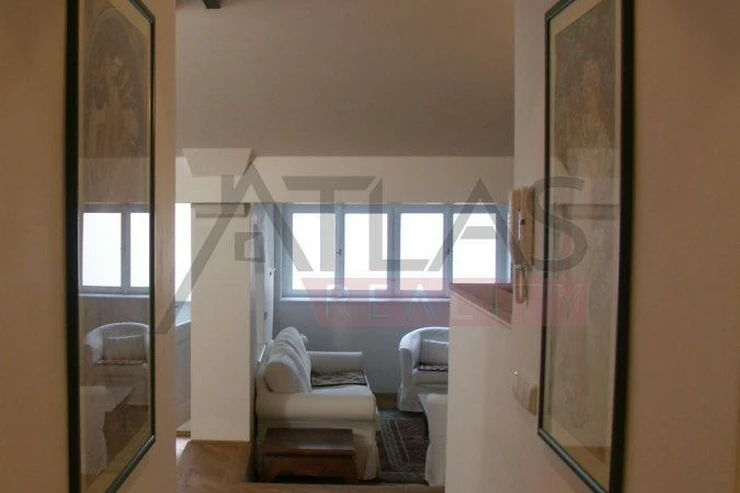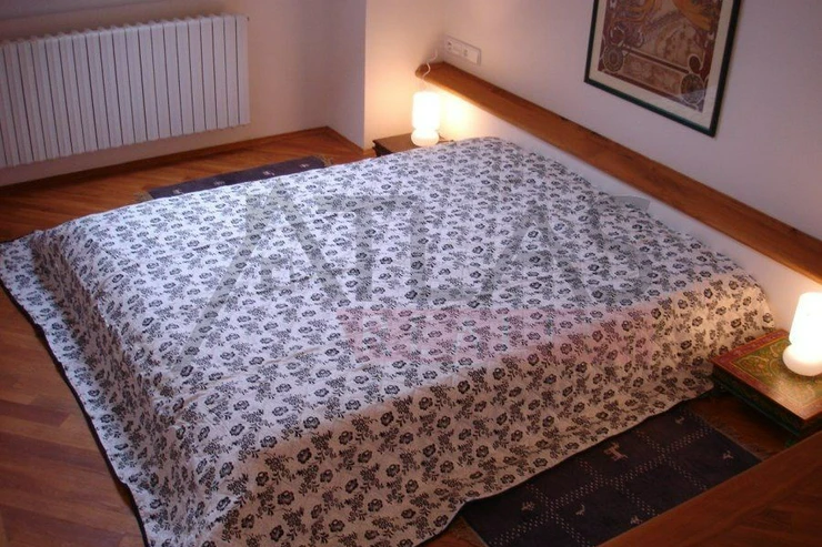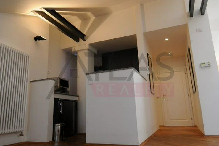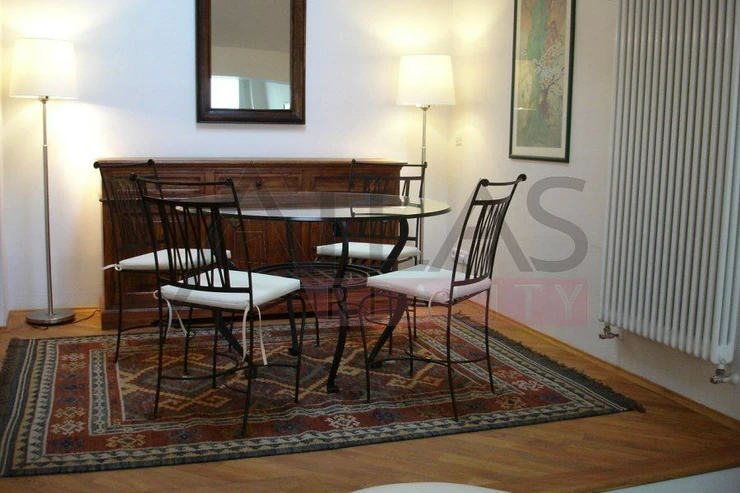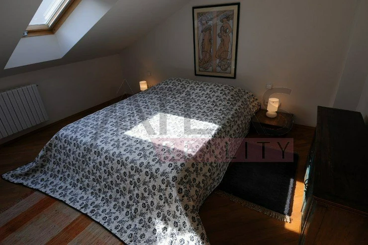 For rent, a two-story attic apartment on the 5th and 6th floors, 96 m2, featuring a magical view of Prague's rooftops and a small balcony with ivy near the living room, original open kitchen facing the living room; impressive fixtures in a luxurious style, oriental carpets (dining room and living room, kitchen, 2 bedrooms, 2 bathrooms, 2 storage rooms). Fully furnished apartment suitable for 4 adults.