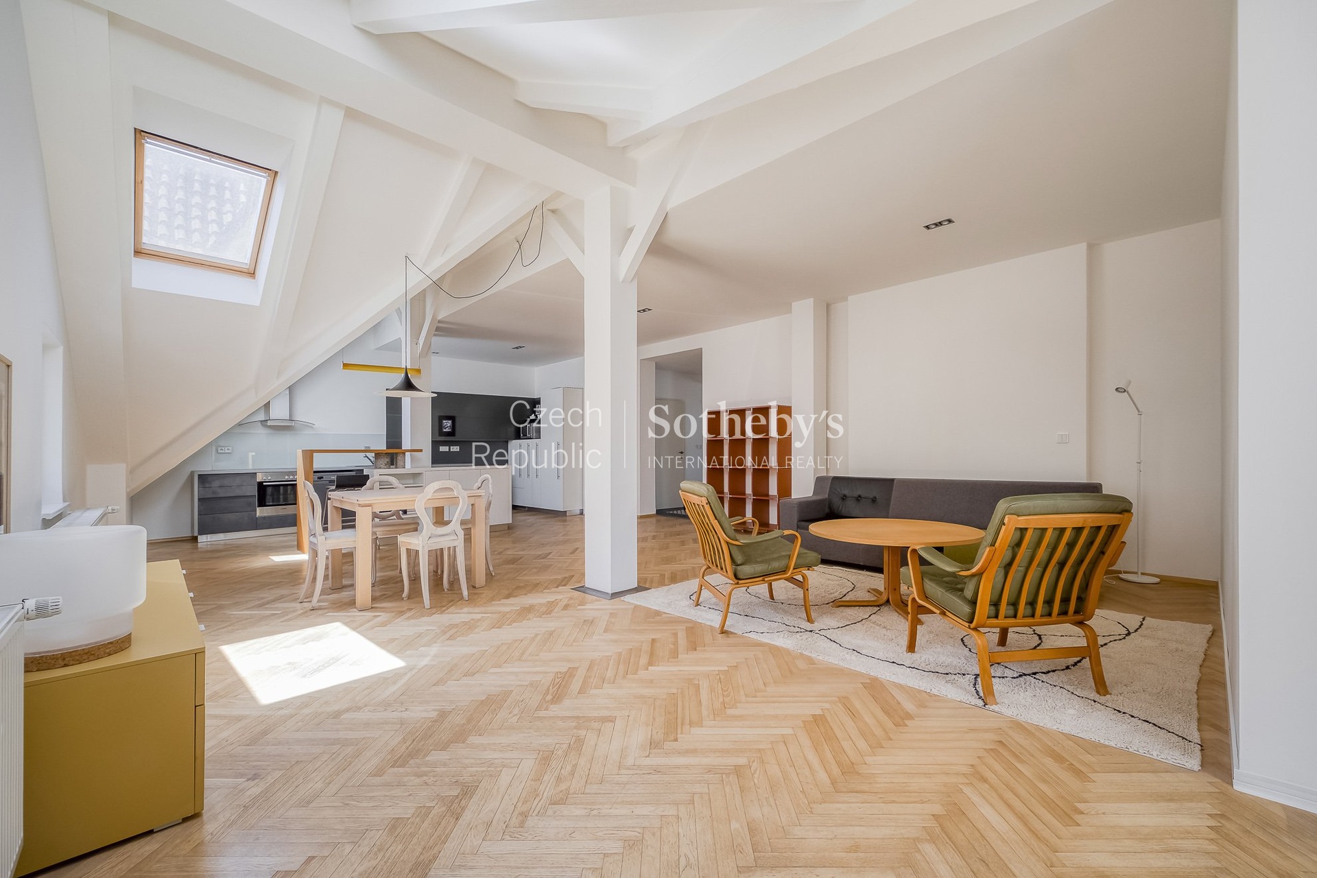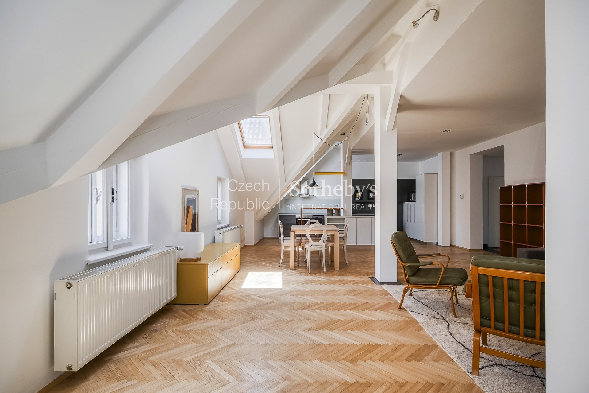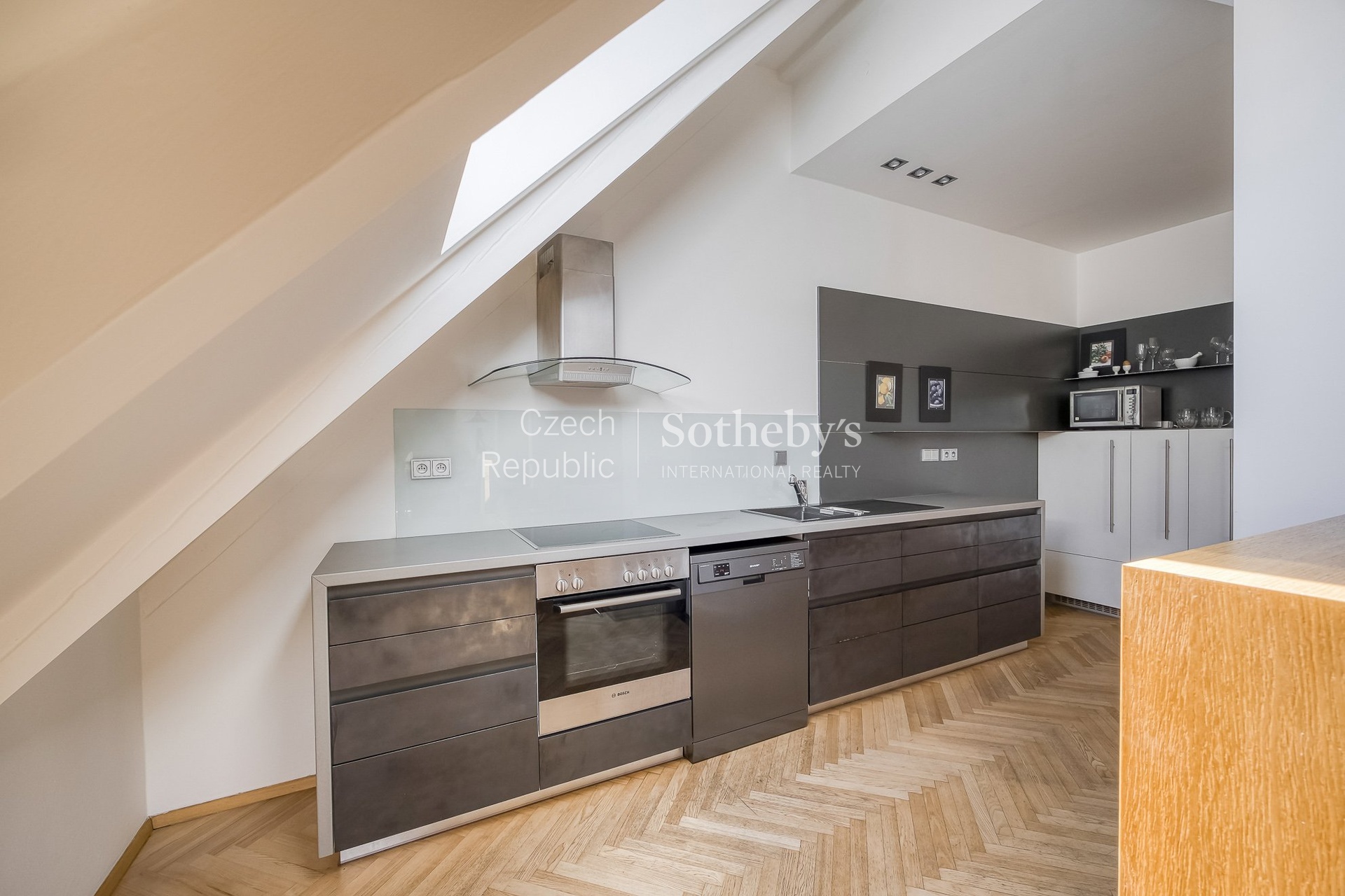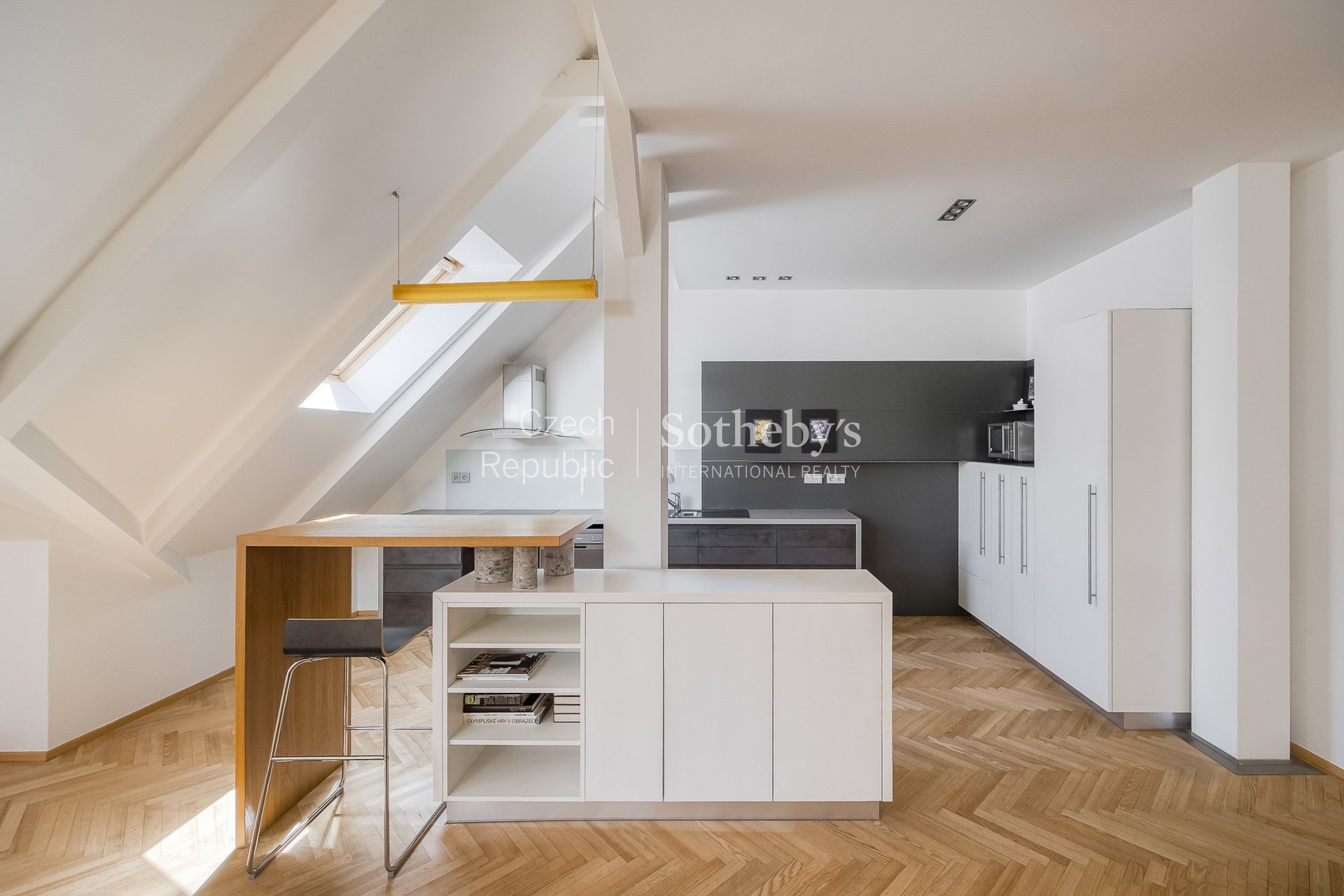 Czech Republic Sotheby’s International Realty is offering for rent a fully furnished attic apartment located on the fifth floor of an early 20th century Art Nouveau residential building with an elevator. The property is situated in the heart of historic Prague, just a few steps from the Vltava riverbank and the Staroměstská metro station.