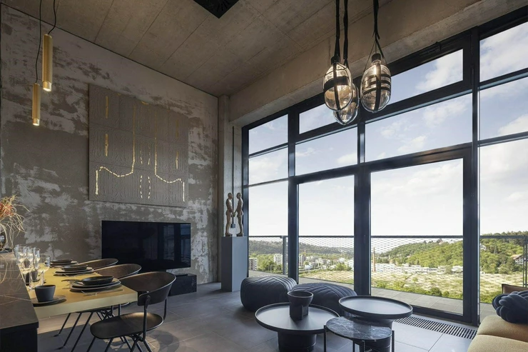 An industrial one-bedroom loft with a floor area of 58,4 m² in the Vanguard residential project offers a unique combination of industrial architecture and freedom for your own interior design. The open-plan white wall space allows you to plan the layout exactly as you envision – from a spacious living room with a kitchen to a bedroom with facilities.