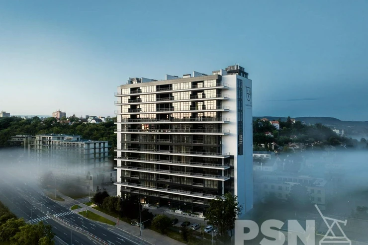 The apartment on the 2 floor includes a balcony extending the living space, plus a cellar. The building’s high standards include a glass facade, brick and double soundproof partitions between the units, fire-resistant glass partitions, videophones, preparation for exterior blinds, air-conditioning, heat recovery, and more. Residents can enjoy a reception desk with concierge service, a wellness and spa zone, a fitness center, a cinema / party room, a glass 18-meter swimming pool, a meeting room, and a laundry room.