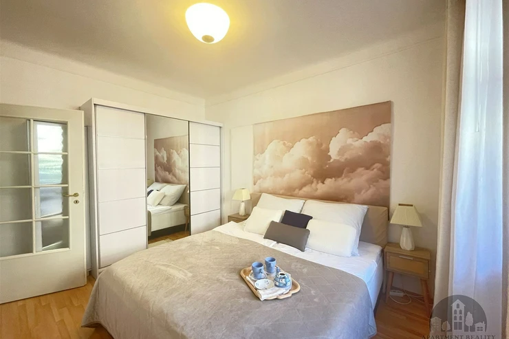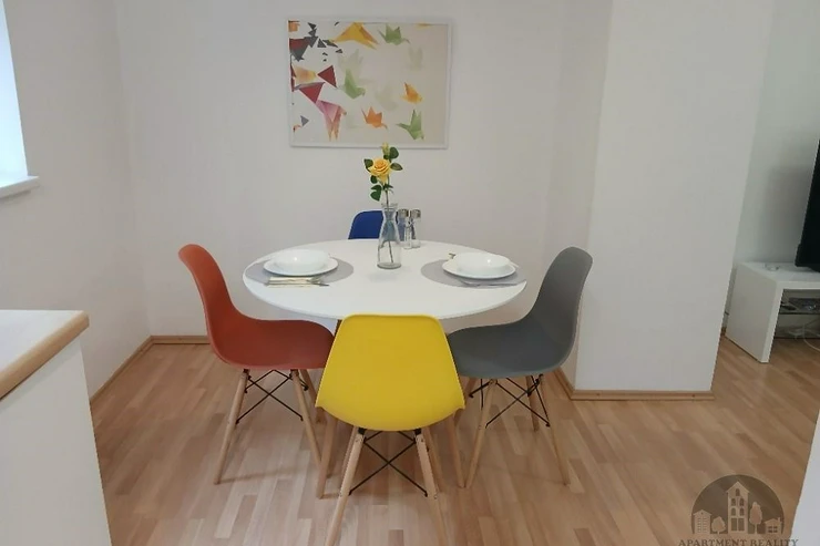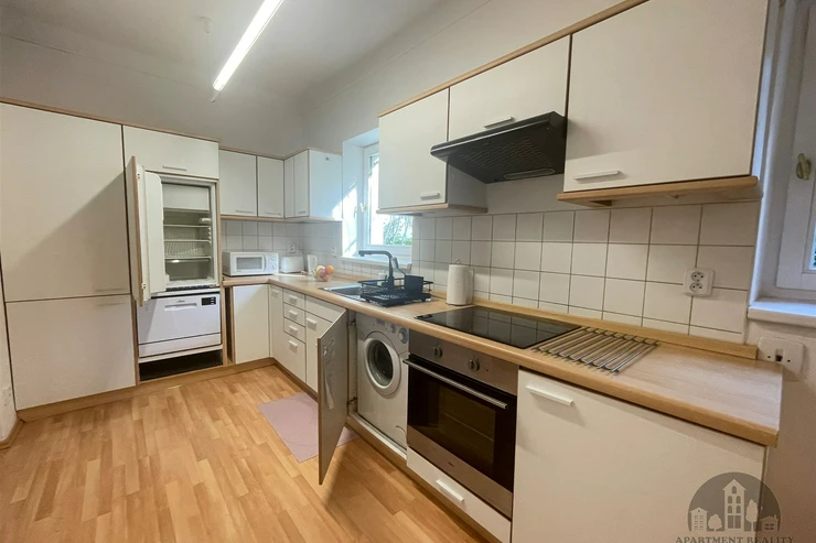 The unit consists of an entrance hall, living room, bedroom, and kitchen with a dining area. It is equipped with new furniture and, in addition to a fully-equipped kitchen (dishwasher, fridge, freezer, oven, ceramic hob, microwave, kettle, toaster), it also comes with a washing machine, large television, desk, sofa bed, bathtub, and an electric fireplace.