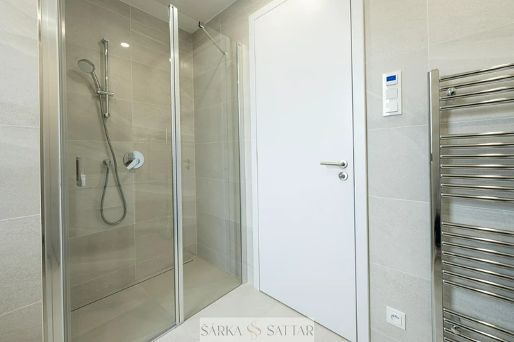 Both the living room and the bedrooms are bright, with a view of Prague 2, have large-format 3-chamber windows and electric blinds in front of the windows. There is heat recovery. The floors are wooden, the bathroom is tiled. Heating is from the gas boiler room in the house.