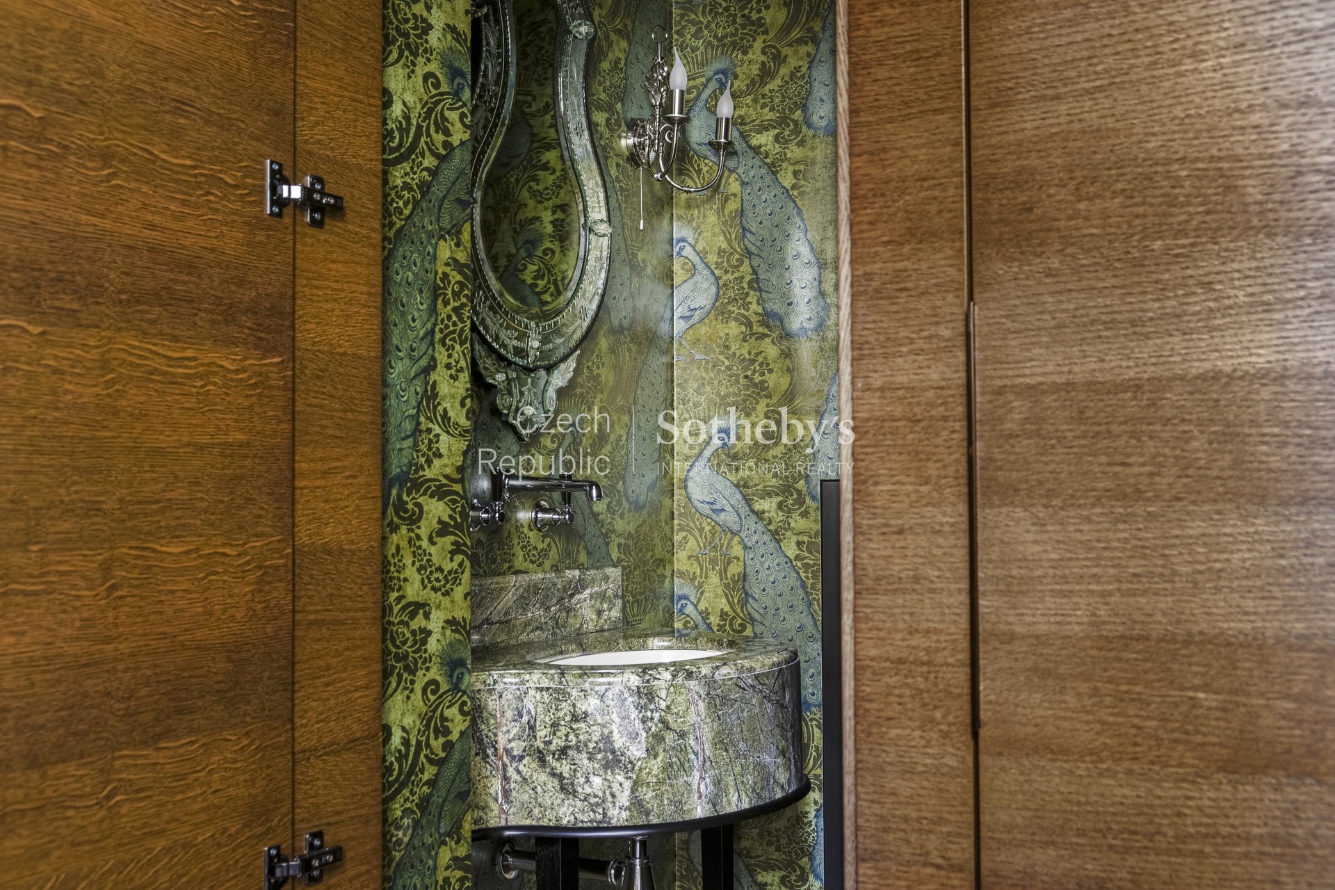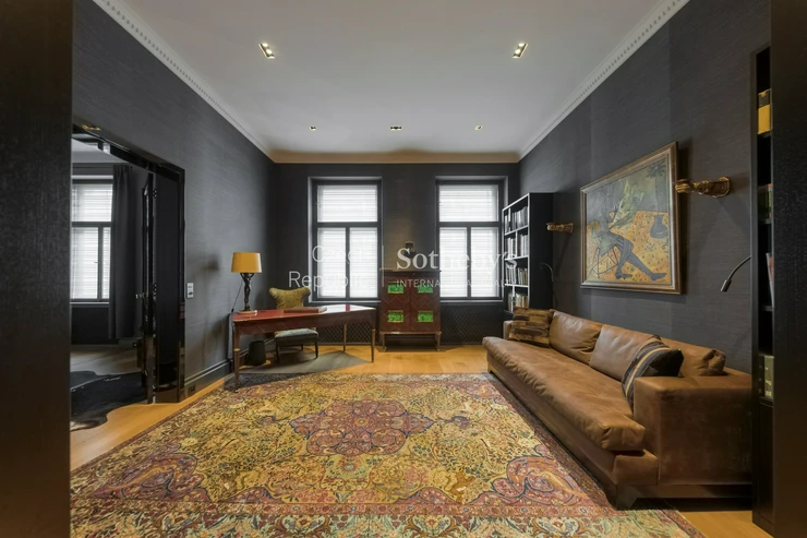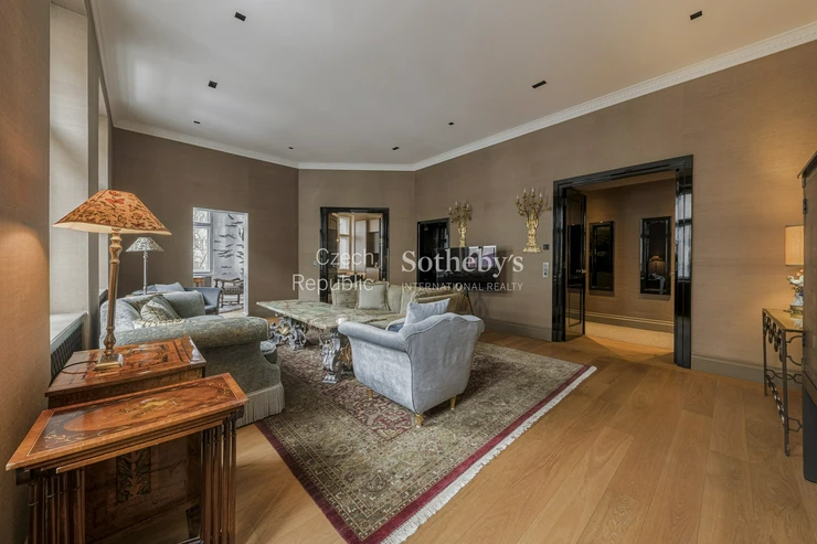 Apartmán uchvátí svou elegancí a zachovanými historickými prvky s jedinečným geniem loci. Na podlahách jsou masivní parkety, koberce, na zdech hedvábné, ručně tkané tapety, v koupelnách mramor či kámen. Ve vstupní hale se nachází vestavěné skříně na míru a toaleta pro hosty. V levém křídle je umístěna koupelna s vanou, dále první ložnice pojatá jako dětský pokoj. Dále je zde prostorná pracovna, na kterou navazuje ložnice.