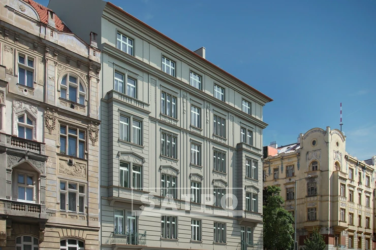 We present to you a premium 2+kk apartment with a perfect separation of day and night zones. Located on the 7th floor of an elegant corner building, the apartment offers an interior space of 56.3 m² and provides exceptional comfort at an address full of style, atmosphere, and soul. A great advantage of this apartment are the large studio-style windows in both rooms facing east. In addition, the property comes with a 3.2 m² cellar.