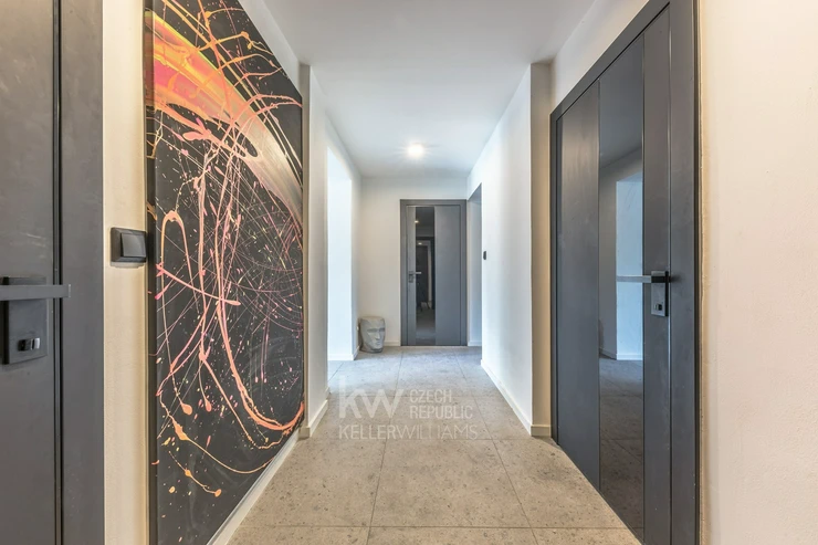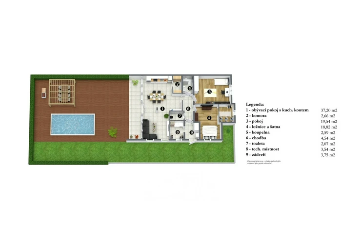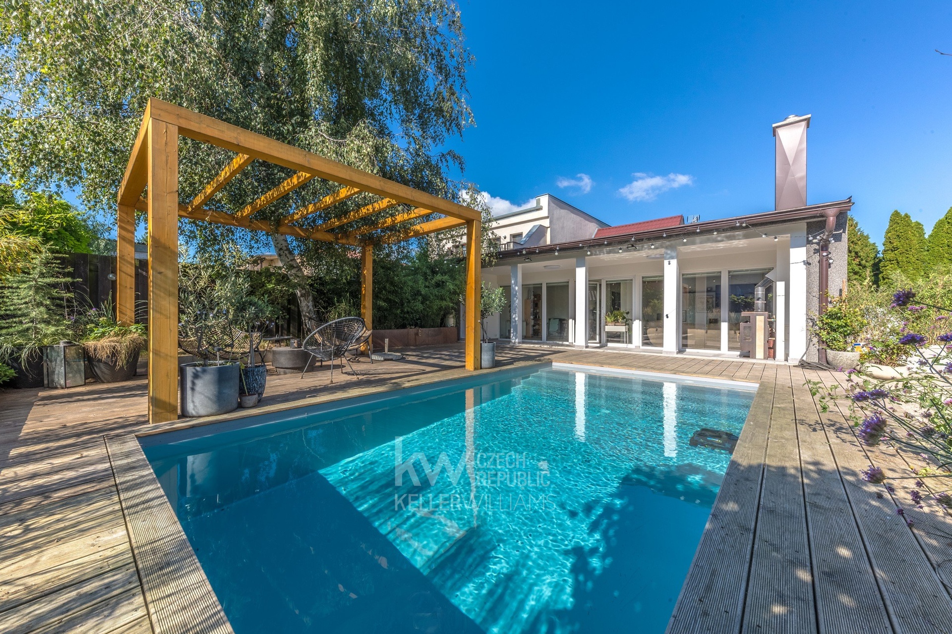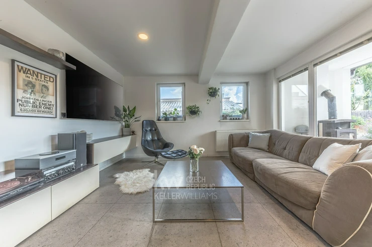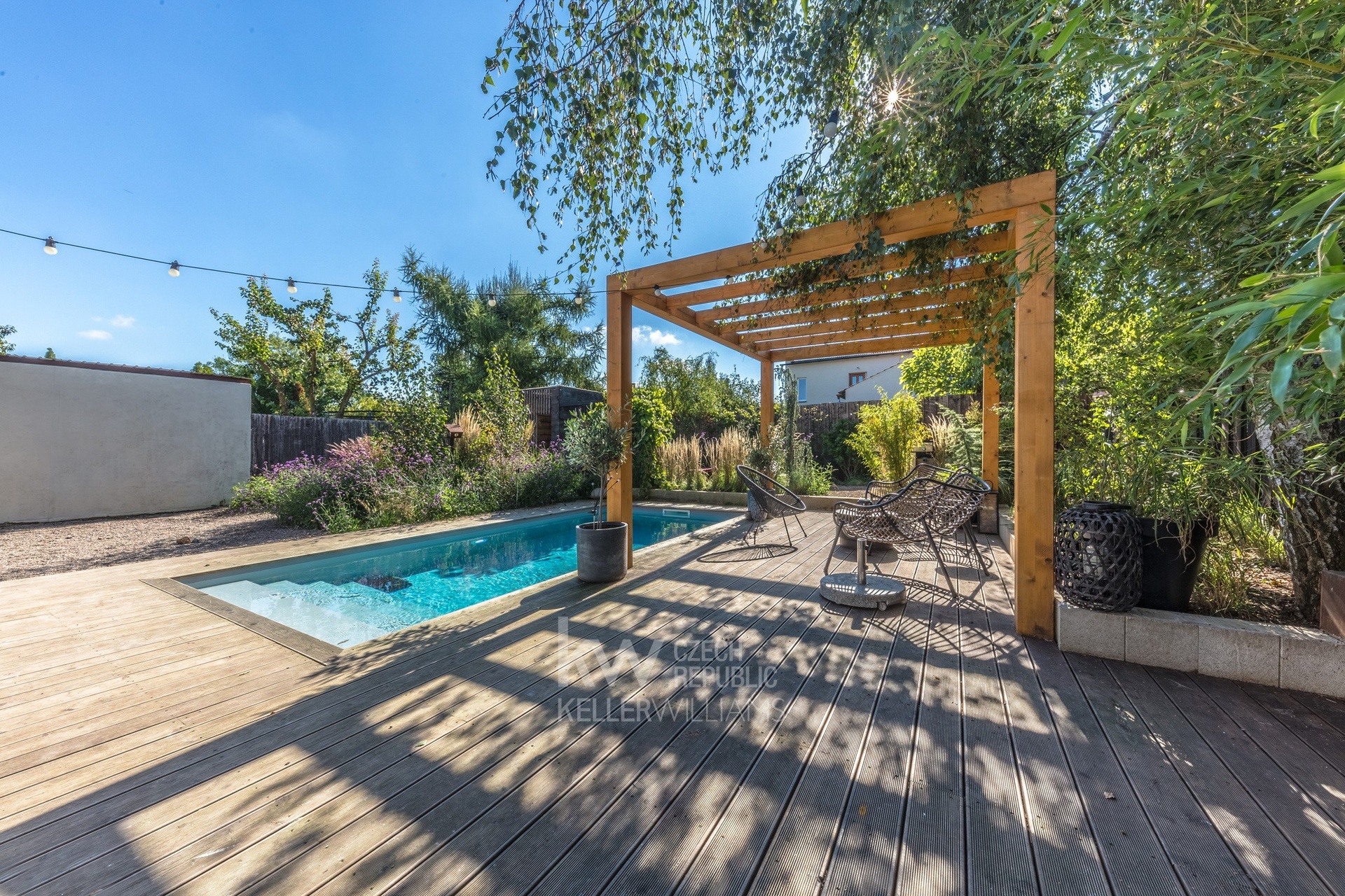 Dominantou domu je světlý a prostorný obývací pokoj s přímým vstupem na terasu a do zahrady s bazénem. Aktuálně se dokončuje instalace nové kuchyňské linky, která je již zahrnuta v ceně. V rodičovské ložnici je prostor také pro pracovní koutek či šatnu. Dětský pokoj je dostatečně velký i pro dvě děti. Dále je zde koupelna se sprchovým koutem, samostatná toaleta a praktická technická místnost, kde je umístěna pračka se sušičkou.