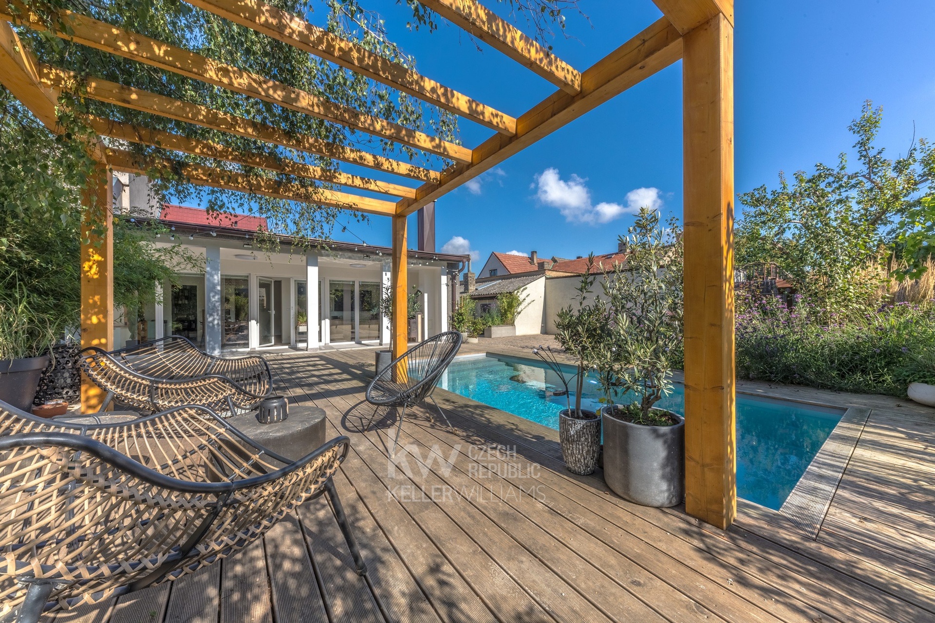 Milovníci pobytu na zahradě jistě ocení zastřešenou terasu s posezením a krbem pro chladnější večery. Dále je na zahradě bazén s pergolou a molo ze sibiřského modřínu. Zahrada tak nabízí různé možnosti využití pro příjemné chvíle s rodinou či přáteli. Na pozemku jsou zachovány také praktické přístavky, které slouží jako úložné prostory. Podkroví nad původní částí domu lze rovněž využít jako další úložný prostor.