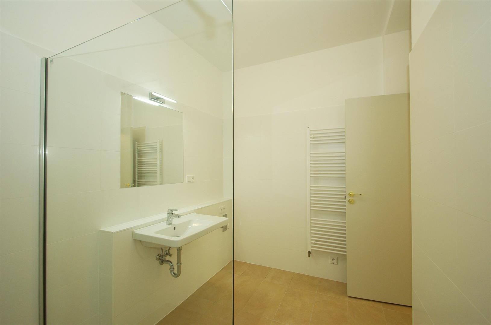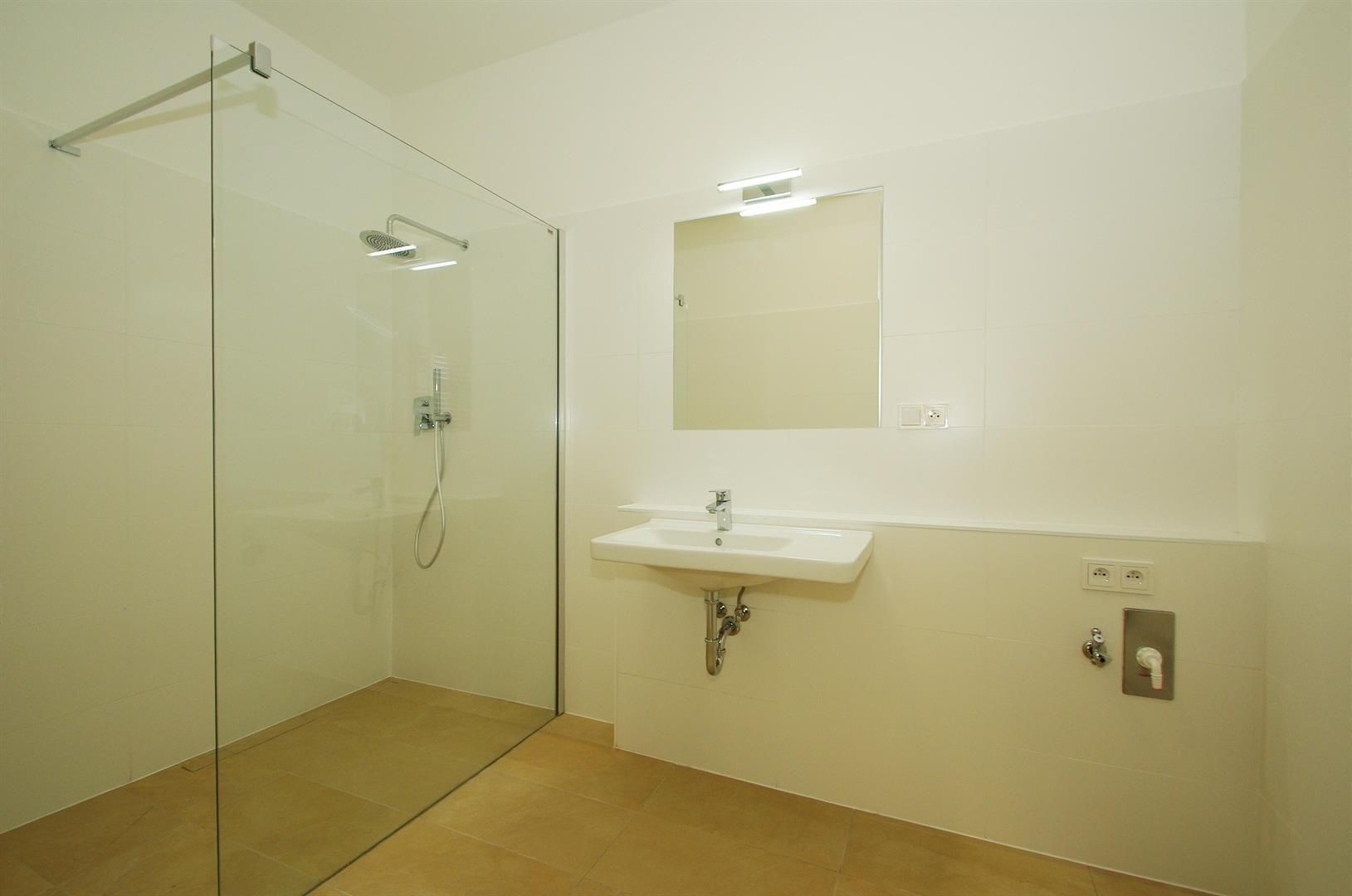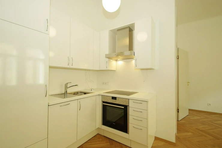 The interior of the apartment is unfurnished and the layout offers an entrance hall, a living room with an equipped kitchenette, a bedroom, a bathroom with a shower, and a separate toilet. The rooms are spacious and bright. The kitchenette is equipped with built-in appliances (hob, electric oven, dishwasher, fridge with freezer). The apartment includes a cellar.