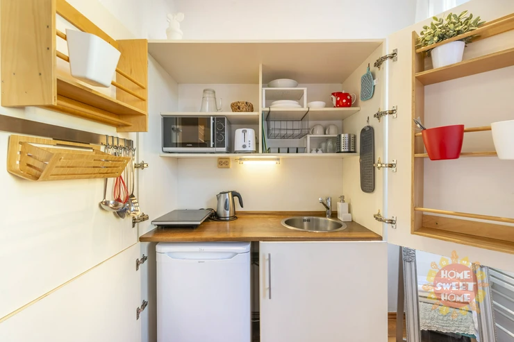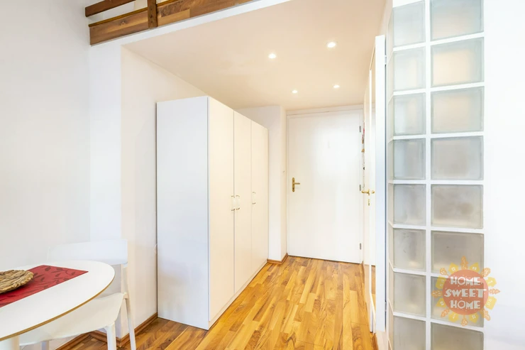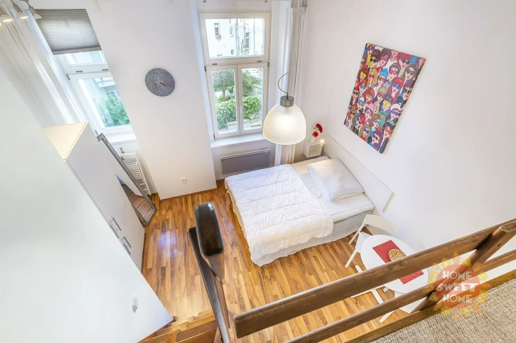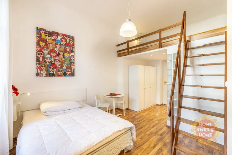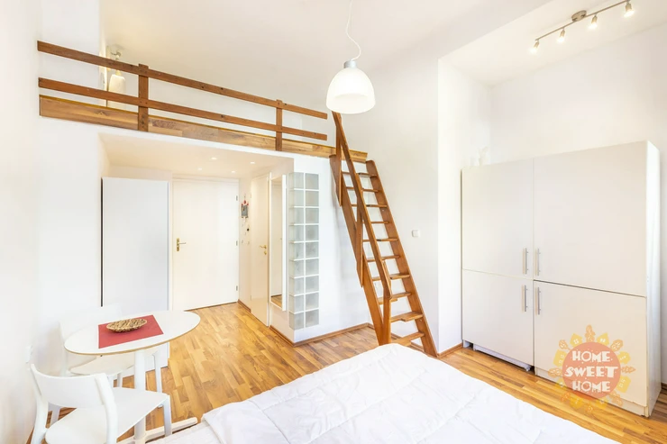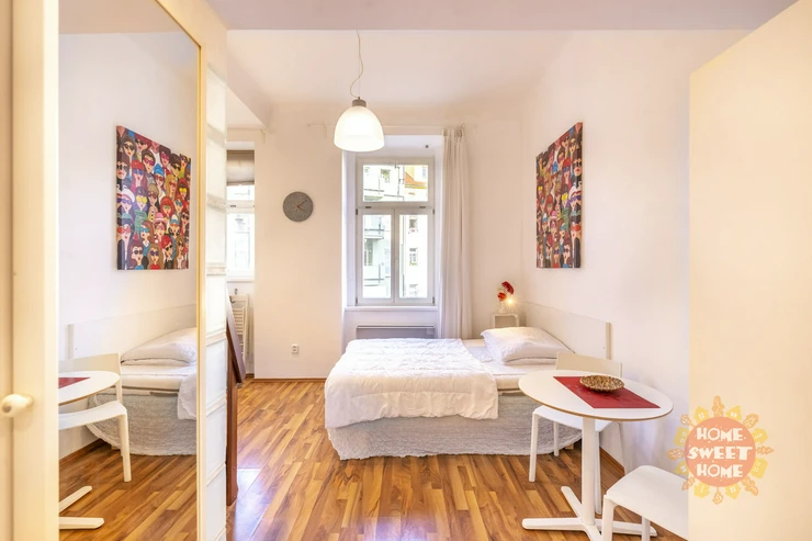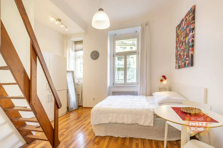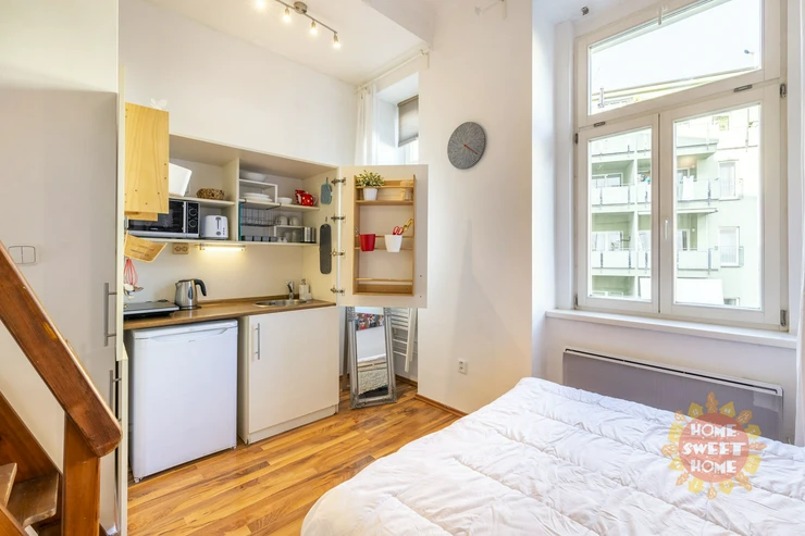We offer for rent a fully furnished studio with a total area of 20m2 on the 1st floor of a brick building with elevator in Bořivojova street, Prague 3, Žižkov. The apartment has a double bed and a bunk for sleeping, a simple kitchen with induction single cooker, microwave, fridge, and basic utensils. The bathroom has a shower, toilet. Washing machine with dryer available in the common hallway, which is shared with 2 other apartments. Internet already included in the rent. Underfloor heating in the bathroom. Floating floor and tiles on the floors. The house and apartment have been completely renovated.
