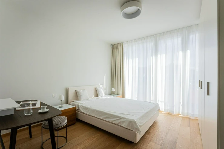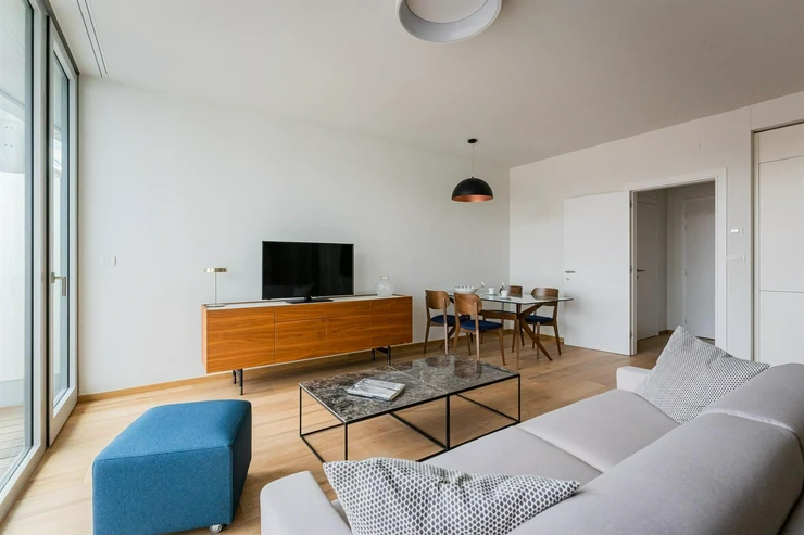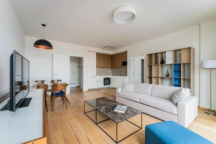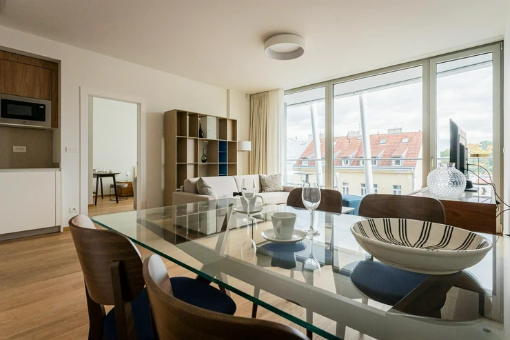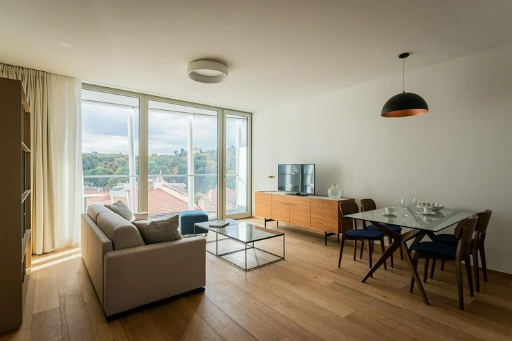 Monthly service and energy fees are included in the rental price of 2200 EUR + 12% VAT. The price also includes cleaning of the apartment twice a month, including changing of bed linen and towels. Wellness membership fee (14m indoor pool and sauna): 2500 CZK per month. Undeground parking is available for a fee of 200 EUR + 21% VAT per month, per parking space.
