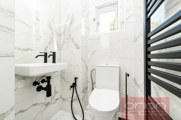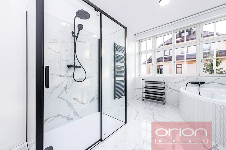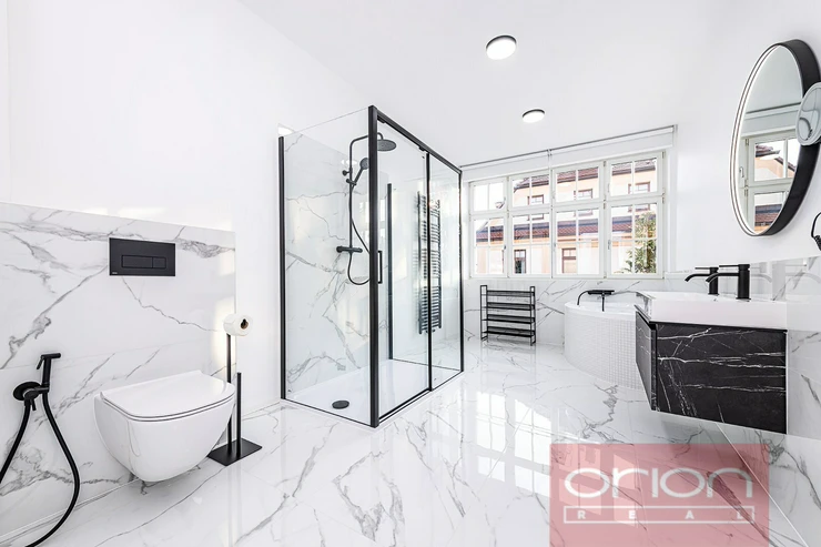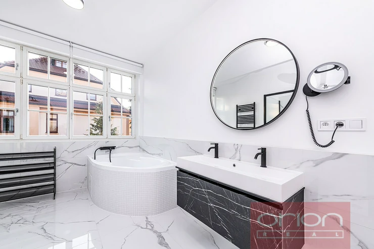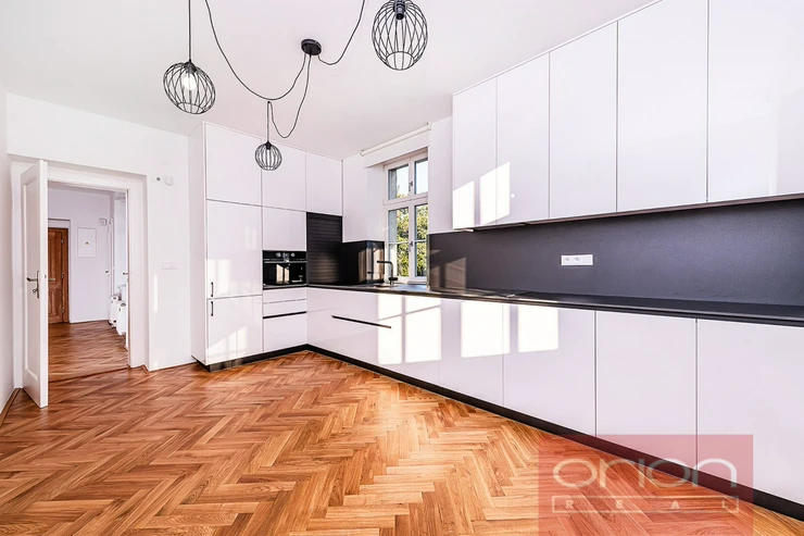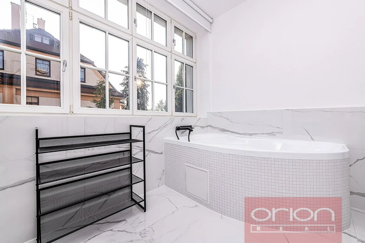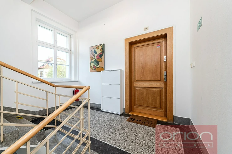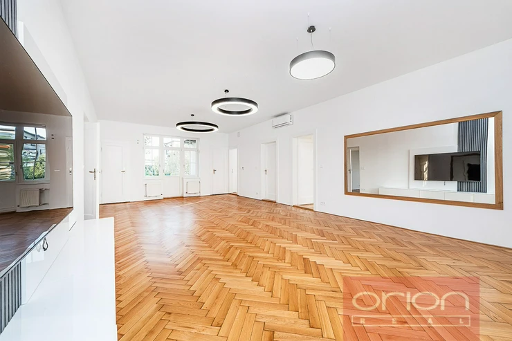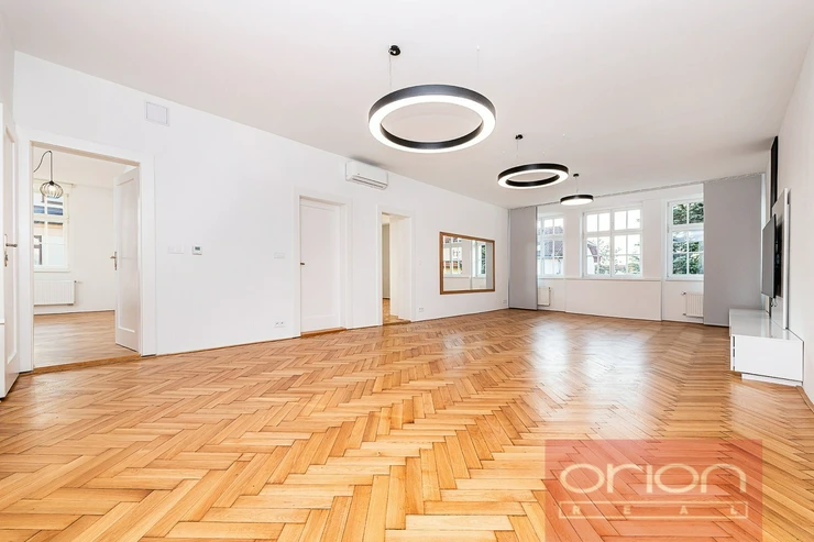 We offer for rent a newly renovated two bedroom apartment on the 1st floor of a house with a well-kept garden in the Hanspaulka residential area in the sought-after location of Prague 6. The total area of the unfurnished apartment is 137 sqm and offers an entrance hall, a spacious living room with access to a loggia 3 sqm, a kitchen equipped with all appliances and connected to a dining area, 2 bedrooms, 1 bathroom with a corner bath, separate shower and toilet, and guest toilet. The apartment is equipped with air conditioning, gas heating, a Jablotron security system with the option of connecting to a central security desk (PCO) and a storage room on the ground floor of the house. The rent includes 1 car parking spot on the plot under a lock and the use of garden.