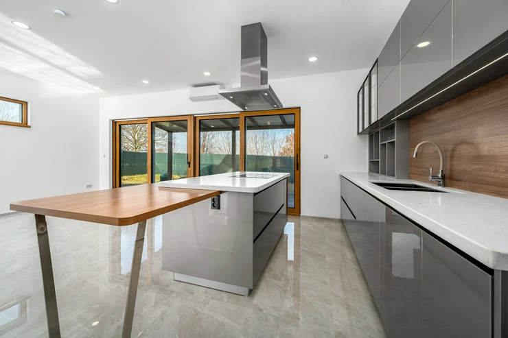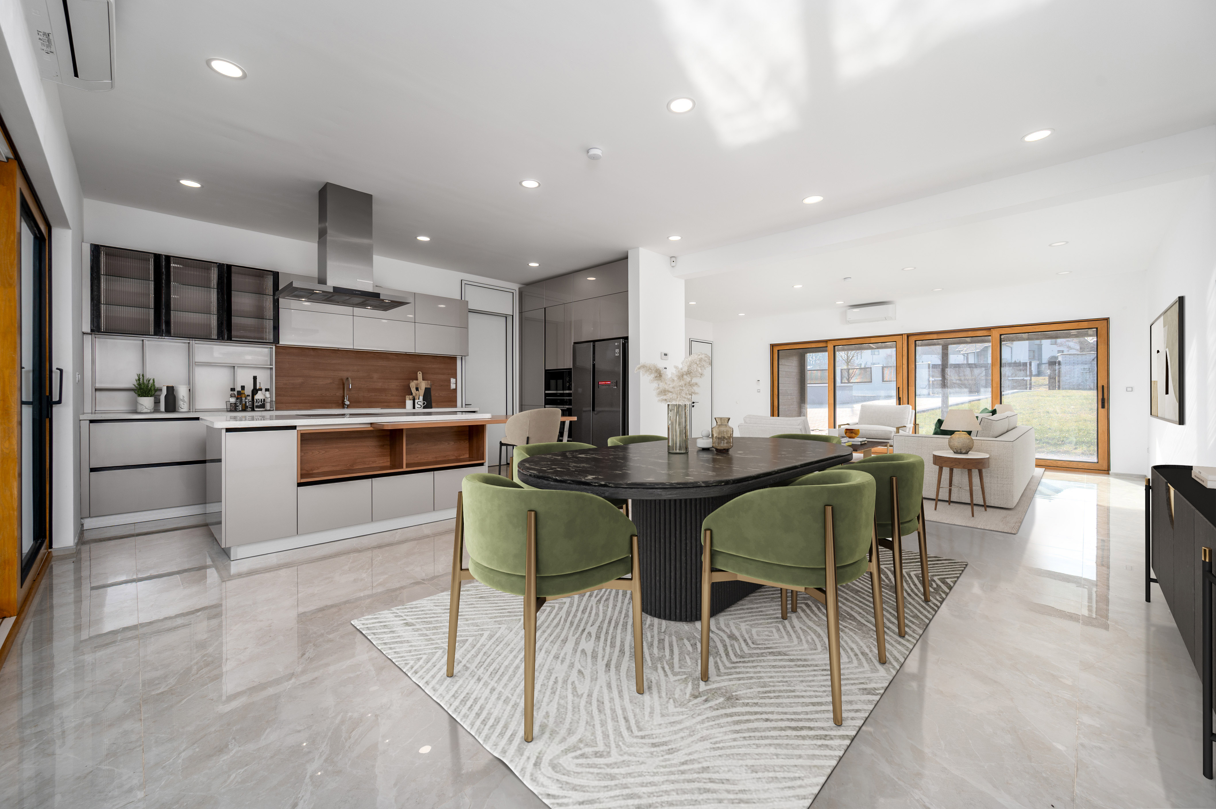 The villa has been built using premium materials: large-format Italian marble tiles, Canadian oak wooden floors, 3D porcelain wall tiles, a custom-made kitchen with a stone worktop, Villeroy & Boch sanitaryware, Bosch appliances, Viessmann heating, and Toshiba air conditioning in all rooms.