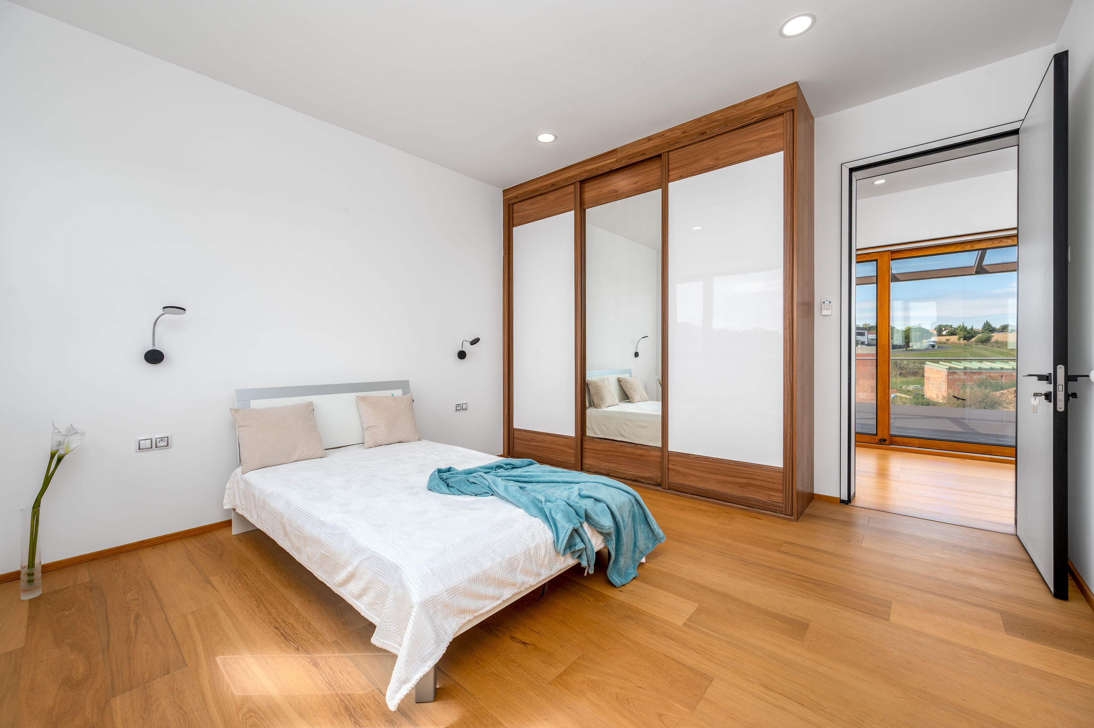 Upstairs you will find the master bedroom with its own bathroom and walk-in closet, two additional bedrooms with built-in wardrobes, a second fully equipped bathroom, and a spacious 70 m² terrace with an aluminum pergola — perfect for relaxation and privacy.