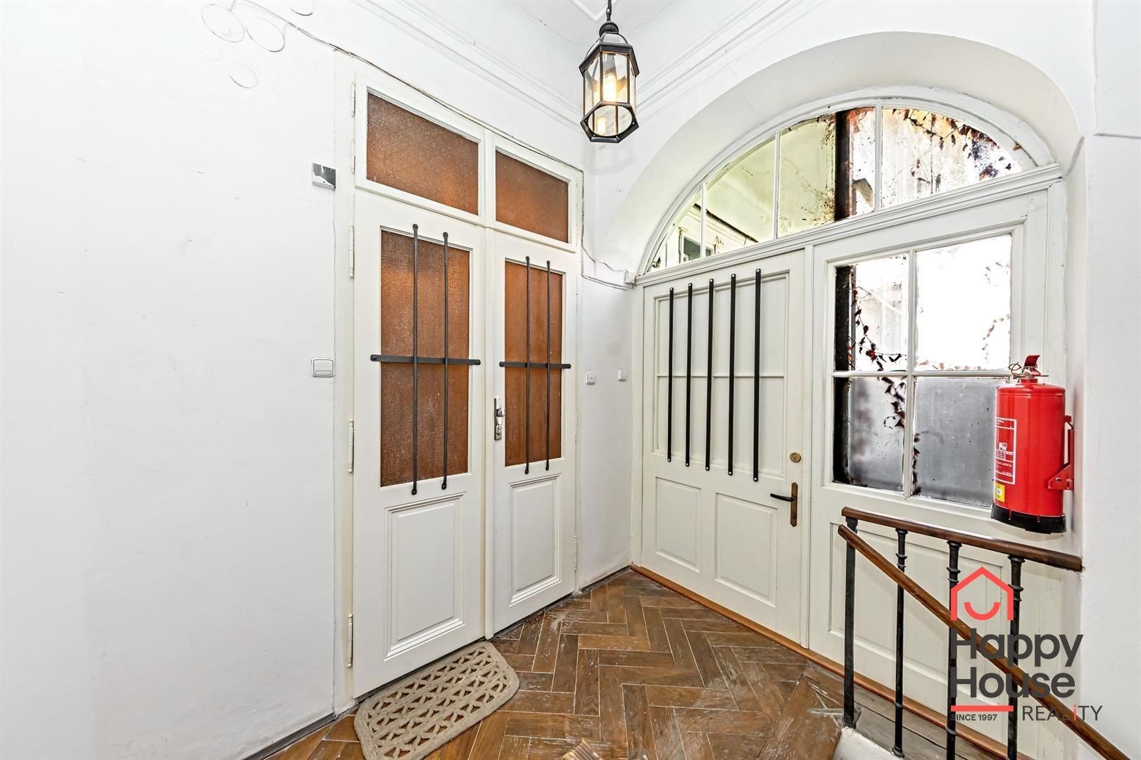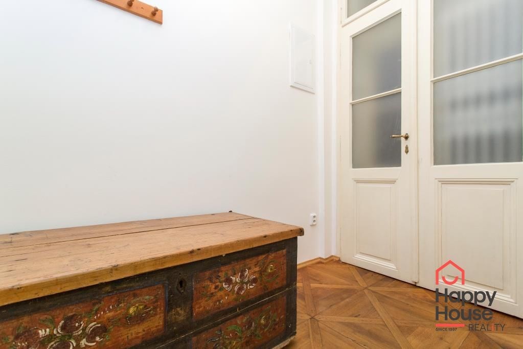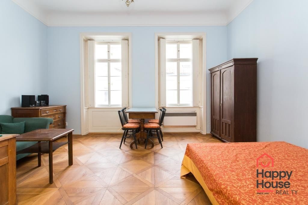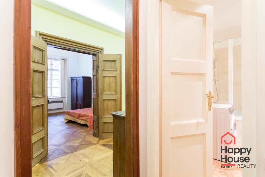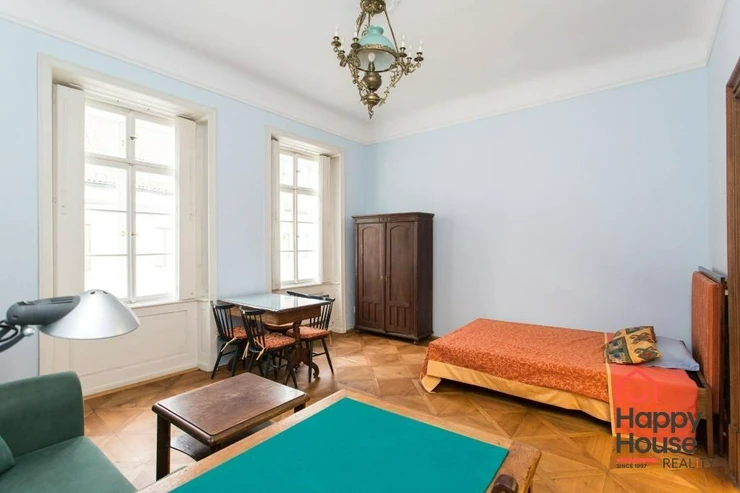 The kitchen features a kitchenette with built-in appliances - ceramic hob, electric oven, refrigerator, dishwasher, and extractor hood. The bathroom includes a bathtub with a shower screen, toilet, bidet, and washing machine. The view from the apartment is of the street on Thunovský Palace, where the Chamber of Deputies of the Parliament of the Czech Republic is located. The floors are made of beautiful inlaid wooden parquets and tiles. The entire apartment is furnished with wooden antique furniture. The apartment has 2 boilers for hot water, is heated by direct electric heaters, and there is a heating ladder in the bathroom.