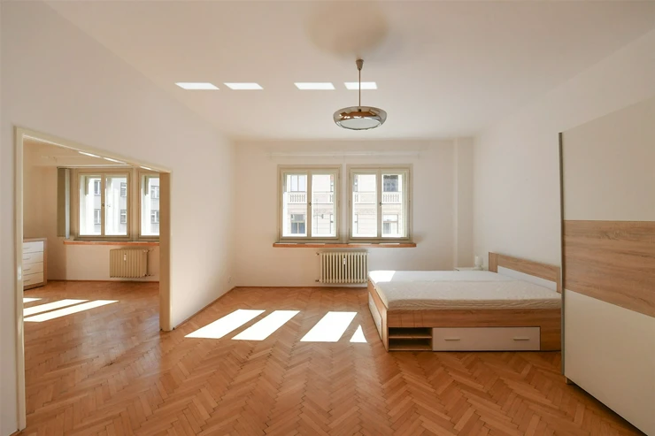We are offering for rent a spacious, bright 2+1 apartment with a total area of 95 sq.m., situated on the 2nd floor of a brick building at one of the most sought-after addresses in Prague - Rybná Street in the Old Town. This location offers excellent accessibility to all civic amenities including local authorities, schools, restaurants, cultural facilities, shops, and medical facilities.