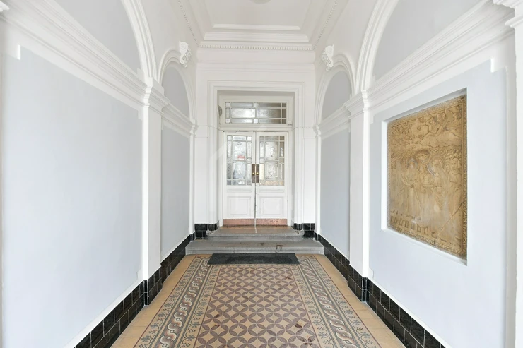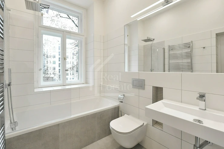 We offer for rent a completely renovated apartment on the Vltava embankment, which will charm you with a panoramic view of the river and the main Prague monuments, including the Dancing House and the Emmaus Monastery. This spacious apartment is located on the first floor of a carefully maintained building with original architecture and preserved historical elements. The building does not have an elevator and offers a shared garden in the courtyard, which contributes to its peaceful atmosphere.