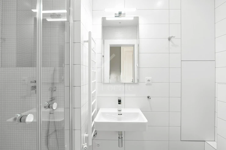 The interior of the apartment is designed to meet the requirements for comfort and practicality. The living room with a fully equipped kitchen, dining area, and large windows offers a wonderful view of the Vltava, Emmaus, and the Dancing House. The master bedroom is spacious and has its own bathroom with a bathtub and toilet. Another room can be used as a second bedroom or study. There is also a separate bathroom with a shower, a utility room, and an entrance hall with built-in storage space. Both bedrooms are oriented to the quiet courtyard, which guarantees peace and privacy.