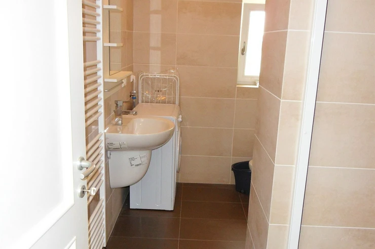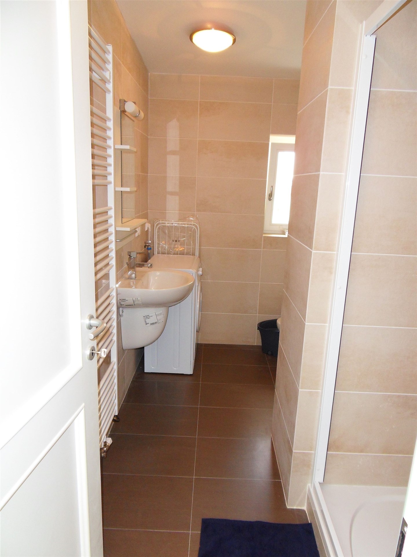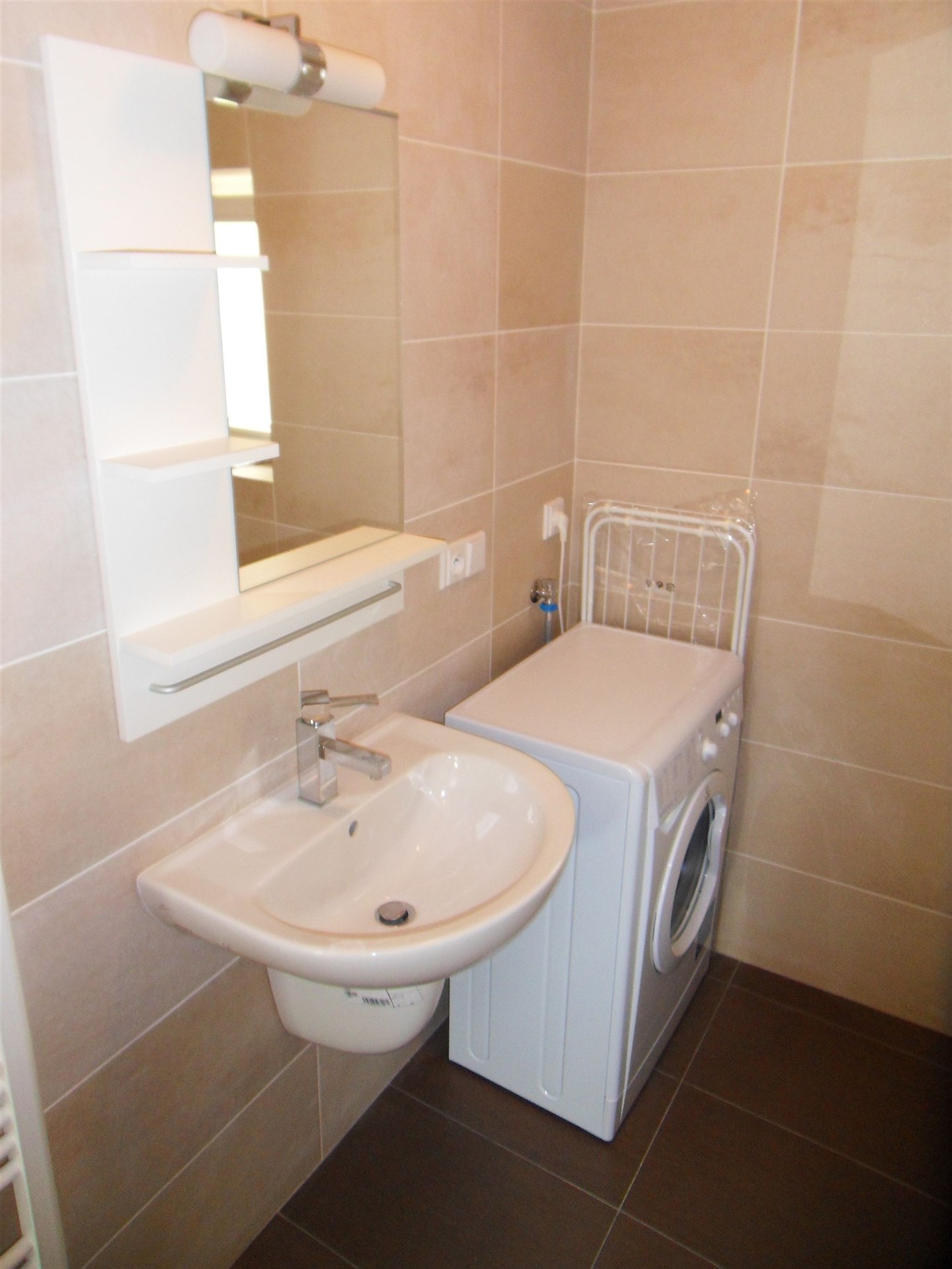 The apartment offers one bedroom with a double bed, French window, and a large wardrobe. A spacious and bright living room with a sofa bed and TV is connected to a fully equipped kitchen. The bathroom has a shower, toilet, sink, and washing machine.