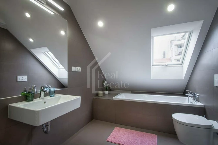 This is an air-conditioned attic unit with a total area of 76,5m2 with plenty of daylight thanks to large skylights. The partial furnishing of the apartment is very tasteful and elegant complemented by beautiful trusses. It consists of a double bed, 2 night lamps, 1x tall lamp, dining table and 5 chairs, a small TV table and an upholstered armchair. The apartment is well laid out and the bedroom is separate from the living room and kitchen area. The bathroom is large enough with a bathtub.