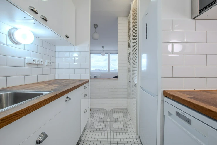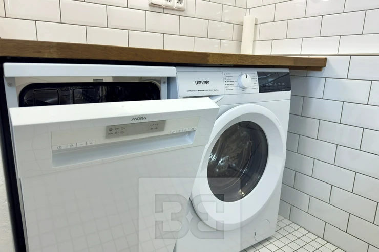 It consists of a living room connected to a kitchenette equipped with built-in appliances – dishwasher, oven, microwave, hob, extractor hood, fridge with freezer, and washing machine.
