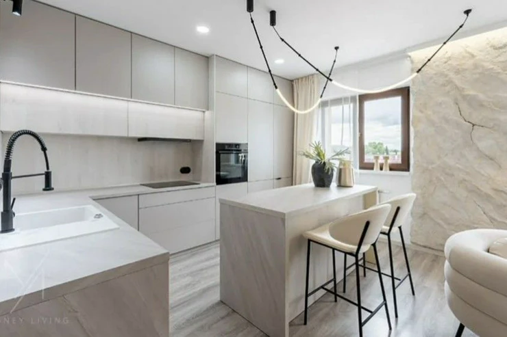 The dominant feature of the living space is an original work of art - a decorative rock sculpture, a current global trend in interior design.