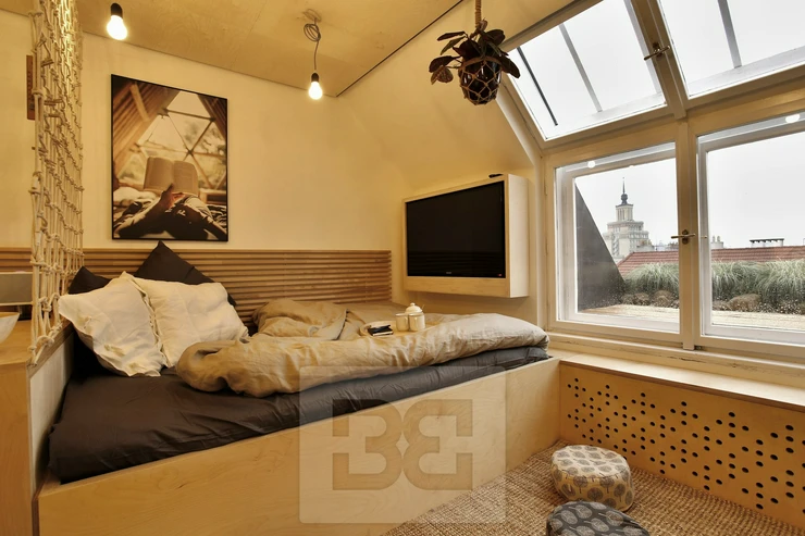 We offer you a designer apartment for rent located on the 6th floor of a building with an elevator, on Zelená Street - Prague 6. The unique apartment with a living area of only 16 m2 offers everything you need for quality living and also the possibility of outdoor seating outside the window with a stunning view of Prague. Fully equipped kitchenette with microwave oven with grill, fridge with freezer, dishwasher, induction hob and extractor hood. There is also a washing machine in the kitchen unit. There is also a separate bathroom with shower and toilet. The room has a raised double bed and a fold-out mattress next to the bed can be used for visitors. The table on its edge can be folded down, allowing seating for 4 people. The seating area in the window is completely unique, see photo. The apartment deserved an article in Prima Living, see link - https://living.iprima.cz/design/microliving-cesko-garsonka-rekonstrukce-minibyt. The apartment has a balcony accessible through the hallway. I recommend a viewing!