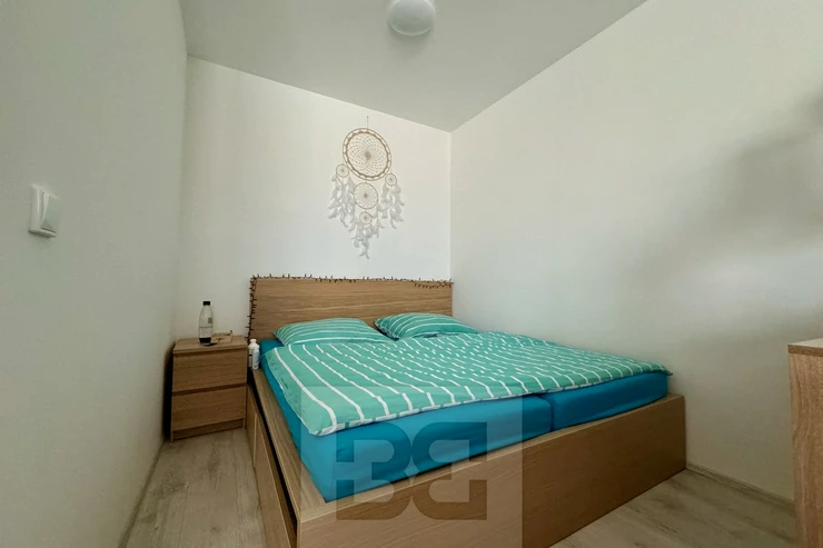 We offer a beautiful, new apartment on Wolkerova Street for long-term rent. The apartment is located on the 7th floor, the top floor of a new building. The apartment windows face a quiet courtyard. The apartment itself consists of an entrance hall, which provides access to a separate, spacious walk-in closet equipped with a shelving system. The apartment also offers a spacious bathroom with a bathtub, sink, and toilet. The spacious room with a kitchenette offers plenty of space for comfortable living. The TV stand, shelves, and shelving unit remain part of the apartment. The kitchen is fully equipped with appliances and was custom-made.