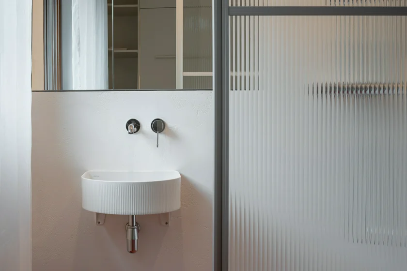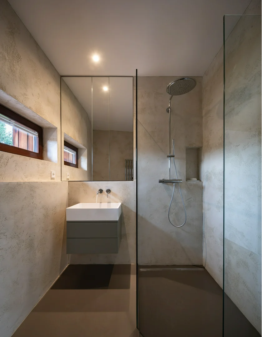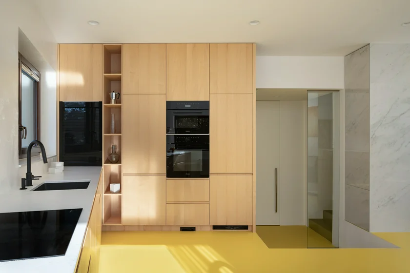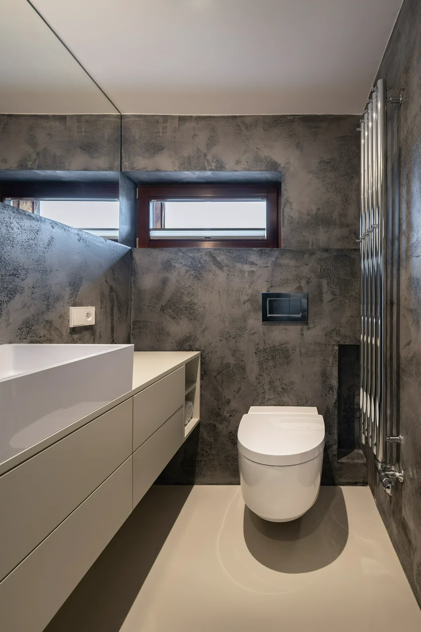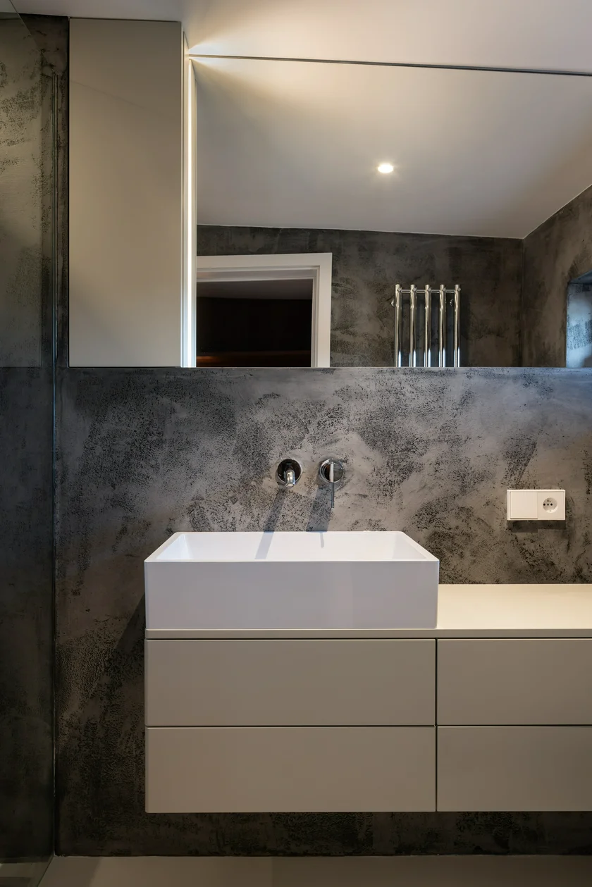 “Great emphasis was placed on details like the rounded corners of the bathroom cabinets, which match the shape of the washbasins,” says David. Polyurethane screeds were chosen for the floors and staircases, while warm oak flooring was installed upstairs to add contrast. The bathrooms feature epoxy screeds on both walls and floors, and the living room was given a focal point with ceramic wall cladding and a fireplace.