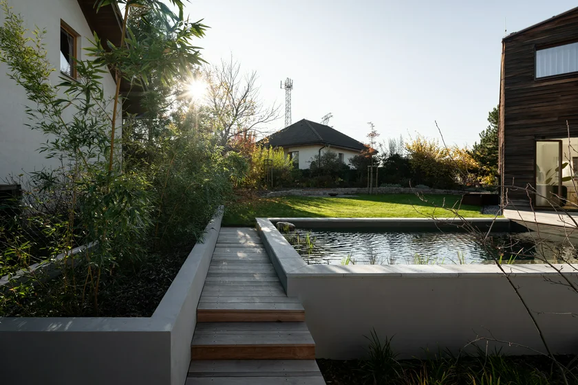 The renovation extended beyond the walls of the home, adding a terrace with a swimming pool, a relaxation house with a sauna, and a landscaped garden with a pond—creating a cohesive indoor-outdoor living experience.
