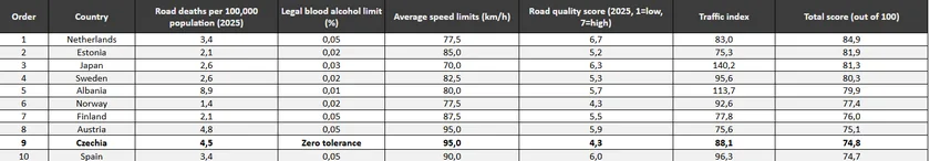 Average speed limits across highways, urban, and rural roads were measured at 95 kilometers per hour: much higher than average compared to other countries in the global top 10. This also put a brake on Czechia's potential ascent in the rankings.