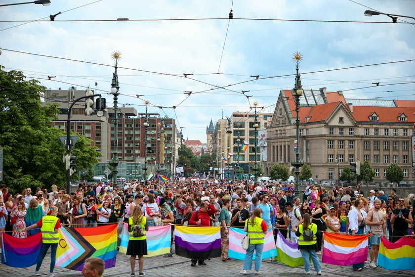 The 2025 parade highlighted both celebration and protest, with participants donning glitter, costumes, and makeup, while others carried signs and flags signaling solidarity across borders. In addition to rainbow flags, marchers waved national flags from Czechia, Slovakia, Hungary, and the European Union. A visible contingent of several hundred people also marched to bring attention to the humanitarian crisis in Gaza.