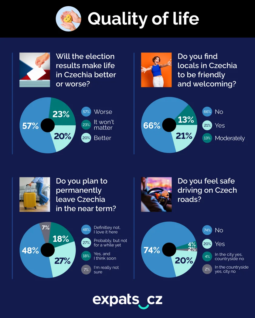 In 2024, we polled our readers to get a snapshot of their feelings about life in Czechia, from their perceptions of road safety to the quality of life and dating norms. These infographics explore your opinions on key aspects such as the friendliness of locals, the cost of living, and the impact of the U.S. election results on your daily lives.